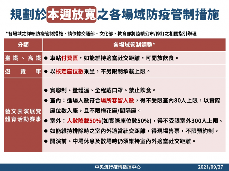 中央流行疫情指揮中心今(27)日表示,考量國內疫情目前已趨緩且穩定控制,經與相關單位溝通討論及評估後,指揮中心規劃於本週起放寬部分場域防疫管制措施,並於10月5日起有條件開放部分休閒娛樂場所,詳細防疫管制措施將由主管部會公布/修訂之相關指引辦理,原則說明如下: