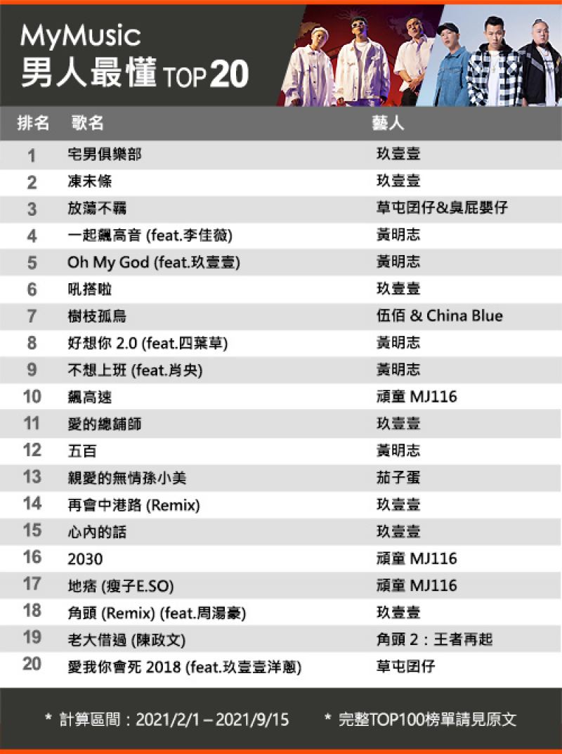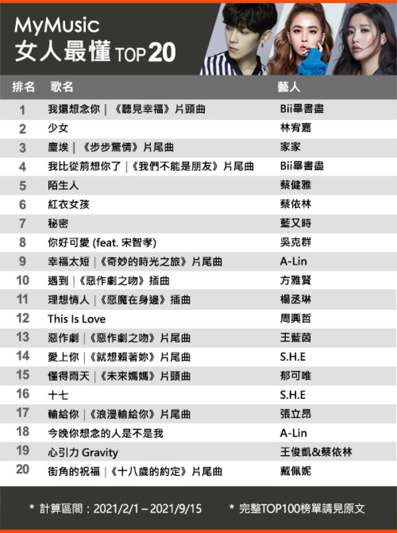 完整【2021男女最懂華語單曲TOP100】請至MyMusic官網查看