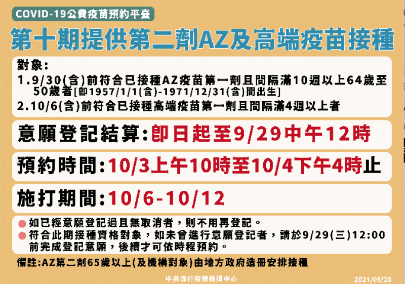 中央流行疫苗指揮中心今(28)日表示,「COVID-19公費疫苗預約平臺」 ( https://1922.gov.tw/ ,下稱預約平臺)第十期將提供AZ疫苗及高端疫苗第二劑接種,相關說明如下: