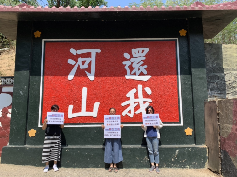 圖二:太極門弟子及法稅改革聯盟金門地區代表,在馬山播音站舉牌,希望政府落實轉型正義,督促國稅局依法撤銷違法稅單,並返還違法拍賣太極門的修行聖地。