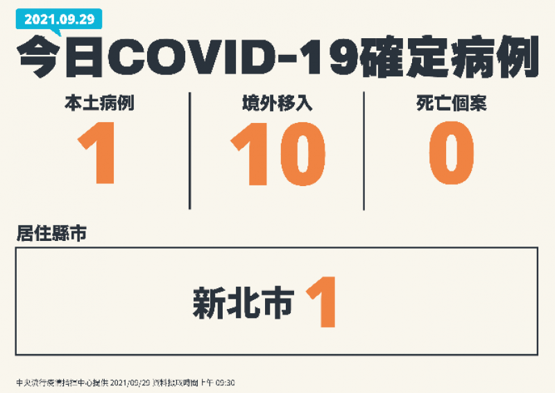 指揮中心指出,今日新增10例境外移入個案,為9例男性、1例女性,年齡介於20多歲至40多歲,入境日介於9月3日至9月28日,分別自美國(案16316)、哈薩克(2例,案16317、案16318)、巴基斯坦(案16319)、柬埔寨(16320)、俄羅斯(案16324)及菲律賓(案16325)入境,餘3例 (案16321、案16322、案16323)的旅遊國家調查中;詳如新聞稿附件。
