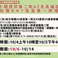 指揮中心說明,昨日宣布增開「BNT疫苗第一劑接種」,調整第十期施打期程,惟考量部分縣市已設置接種站量能,為避免影響合約醫療院所人力調度安排,故維持自10月6日起開打,後續將視預約情形及疫苗供應期程適時調整接種對象,籲請民眾屆時準時前往接種。