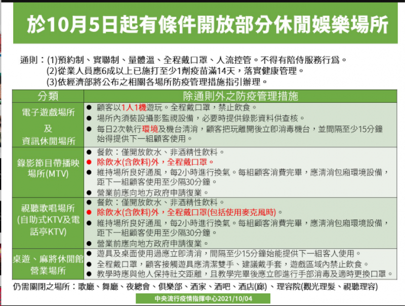 雖然全國仍維持二級警戒,但各類防疫已措施逐步放寬,中央流行疫情指揮中心今(4)日宣布最新防疫鬆綁,明天將開放部分休閒場所有條件開放包含電子遊戲場所、資訊休閒場所、錄影節目播映場所、視聽歌唱場所(自助式KTv和電話亭式KTV)、桌遊、麻將休閒館營業場所,餐飲場所不限制使用隔板或維持1.5公尺間距,且開放宴席時可以離桌敬酒。
