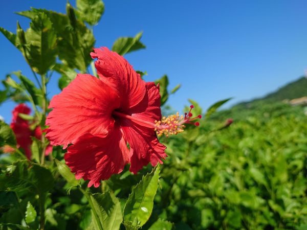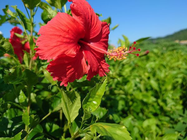 這次測試近物攝影的表現,兩支手機都是對焦於紅花主體中心,這次背景虛化從花蕊到花後的綠葉,以及藍天、色澤與光影也幾乎完全相同。