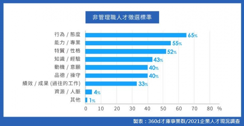 360d才庫事業群董事長楊朝安表示,如何在大離職潮中搶奪優秀人才,使危機變轉機成了人資的重要課題,本次調查顯示企業在挑選人才時所注重的標準,與組織需求的適切性,及瞭解企業是否成功建立「對的人」之人才指標。根據報告統計結果,企業在挑選一般職人才時,最看重的標準為行為/態度(65%),其次為能力/專業(55%)與特質/性格(52%)。同時企業亦會考量人才與組織內部的合適度,其中「人才與職務性格需求」(74%)最受重視,緊接著為「人才與部門人力特質 / 組織人力特質」(69%),可以看出企業最在意員工的「適才適性」。