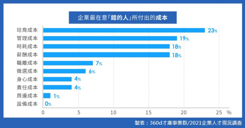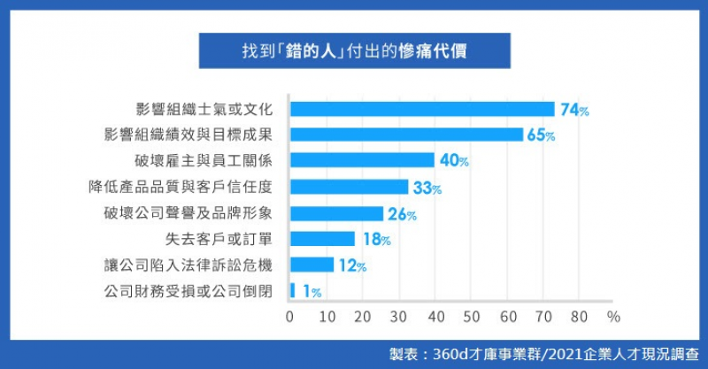 招募到對的人才不容易且過程繁複,超過3成企業招募一般職人才時,需要面試5、6人,將近2成企業,甚至得面試7、8人才能決定適合該職位的人選。在這當中,有3成企業認為找到「對的人」機率在31%至50%之間;4成企業「找錯人」的機率逾30%。找對人皆大歡喜,但若找錯人則必須承擔人力資源十大成本,其中,企業最在意的為培育成本(23%),緊接著是管理成本(19%)、時耗成本(18%)以及薪酬成本(18%)。而背後所需付出的慘痛代價中,「影響組織士氣或文化」(74%)、「影響組織績效與目標成果」(65%)位居前兩名,可見企業培養一名新進員工不只耗費金錢,付出的心力也相當龐大。