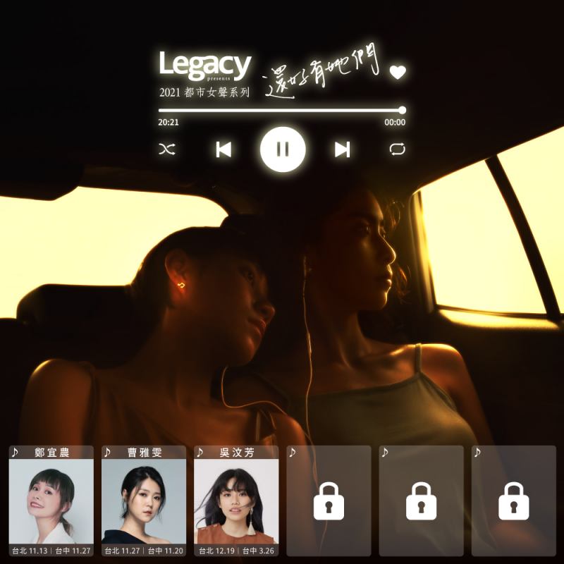 每年Legacy都市女聲都是樂迷最期待的演唱會系列,今年公開前三位陣容,包含鄭宜農、曹雅雯、吳汶芳。剛以專輯《自本》拿下金曲歌后的曹雅雯首次登上都市女聲的舞台,將帶給樂迷一系列「Chill」意濃濃的台語作品。