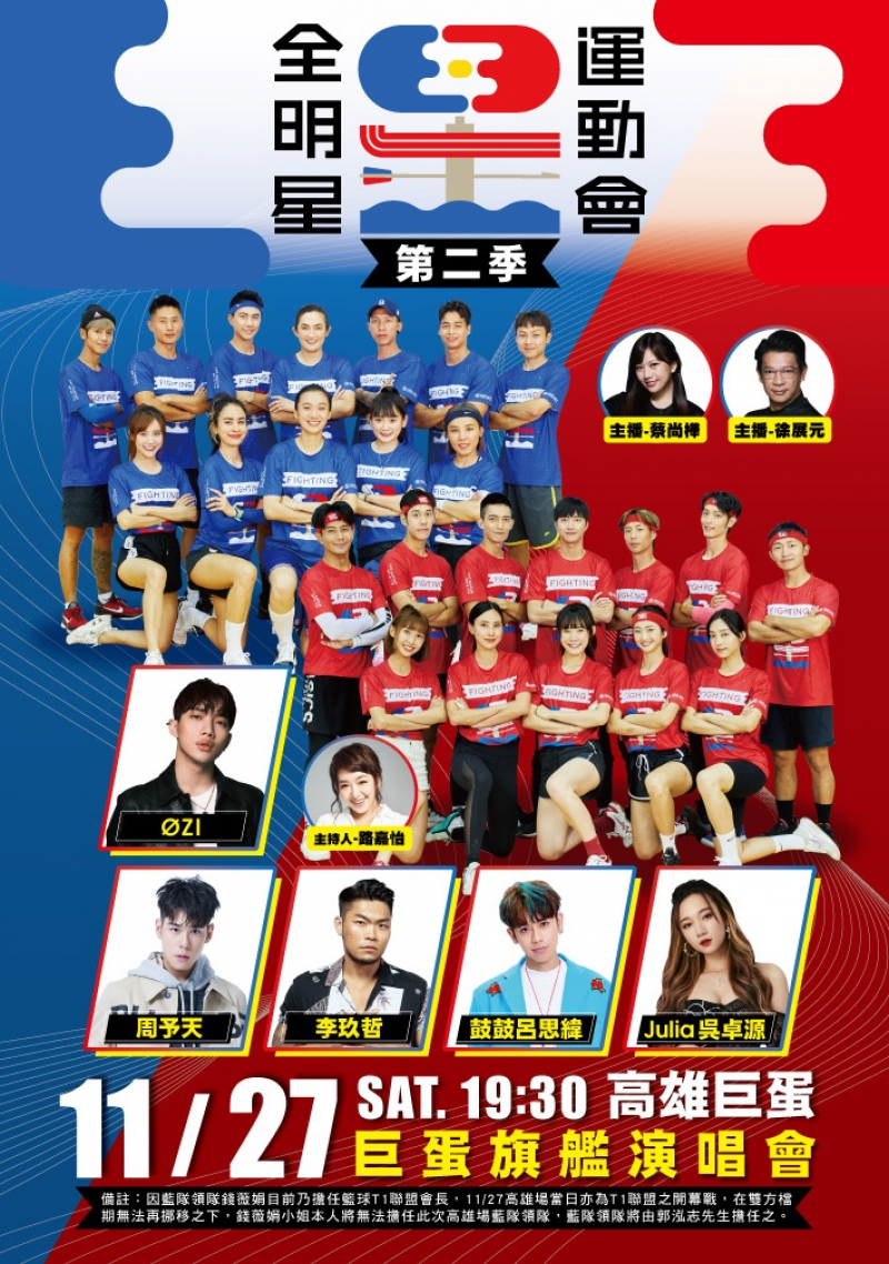 獲得今年金鐘獎益智實境節目獎的「全明星運動會」,5/30高雄表演賽終於確定延到11月底舉辦!除了有江宏傑與代理隊長郭泓志領軍的明星選手熱血賽事之外,還邀請李玖哲、ØZI、鼓鼓呂思緯、Julia吳卓源和周予天助陣開唱,不僅激勵選手,更炒熱現場氣氛!