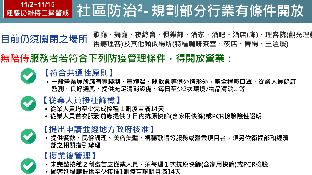 目前仍需關閉之場所(歌廳、舞廳、夜總會、俱樂部、酒家、酒吧、酒店/廊、理容院等),若無陪侍服務者,符合防疫管理得有條件開放。