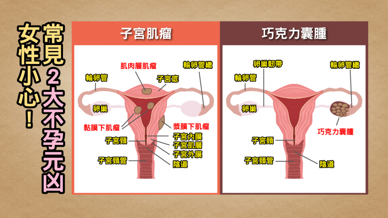 除了高齡問題,不孕因素還有百百種,王樂明分析,「像骨盆腔發炎導致沾黏,或抽煙導致輸卵管內纖毛運動減慢,讓胚胎不易運輸」,都可能增加受孕的難度,門診最常見的兩大不孕元凶為「巧克力囊腫」及「子宮肌瘤」。他進一步解釋,「巧克力囊腫」會讓卵巢功能受損,有些患者會選擇開刀處理病灶,「如果復發次數過多,開刀次數過多,卵巢飽受摧殘就可能讓受孕機率降低」。子宮出現肌瘤,則會影響胚胎著床,也會造成不孕的可能。