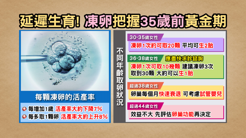 打從女性出生,卵子就存在卵巢隨著年紀老化,35歲後卵子的數量和質量會快速地下降,為了跟時間賽跑,愈來愈多的女性會選擇凍卵,像女星林志玲、張本渝、羅巧倫等,都已超前部署完成凍卵,替未來求子留一線生機。王樂明建議,凍卵的年紀愈年輕愈好,黃金時期約在25歲到30歲間,每增加1歲活產率就下降7%。取卵的數量,建議大概至少要4到 5顆,甚至多一點比較安全,每多取一顆卵,活產率約上升8%。