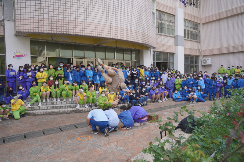 師生在校園廣場欣賞表演者劉予寬的跑酷表演。(圖/正德國中提供)