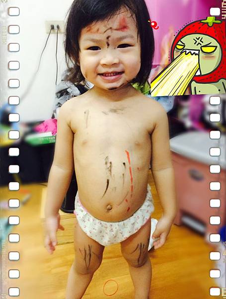 有次阿牧去煮個飯,一回來沒想到歆歆被姐姐畫成這模樣