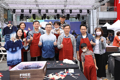(FREE輝盟國際股份有限公司執行總監-賴鵬超(左四)帶領民眾製作藍染DIY服裝)