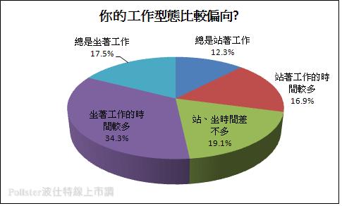 波仕特線上市調網(http://www.pollster.com.tw)在2012/5/4就首先針對民眾進行「請問你的工作型態比較偏向?」問卷調查,結果顯示約有三分之一的受訪者表示「坐著工作的時間較多」,占34.3%的比例,其次相鄰比例約各占五分之一的比例則分別有19.1%的民眾表示「站、坐時間差不多」,17.5%的民眾「總是坐著工作」,16.9%的民眾則「站著工作的時間較多」,另外約有十分之一的民眾表示「總是站著工作」,占12.3%的數據。