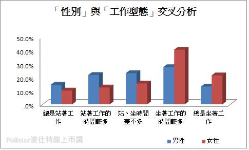 從「性別」與「工作型態」交叉分析可以看出相對來說女性較男性偏向「坐著」的工作型態,因此在「坐著工作的時間較多」女性占40.4%的比例,男性相對只有占27.6%的數據、「總是坐著工作」女性占21.5%的數據,男性則是僅有占13.1%的比例。相反地在「總是站著工作」及「站著工作的時間較多」則男性相對女性則相對占較高比例。
