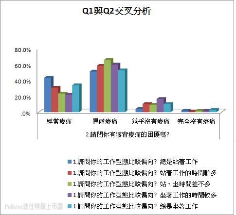 從「請問你的工作型態比較偏向?」及「請問你有腰背痠痛的困擾嗎?」進行交叉分析則可以看出相對來說「總是站著工作」相對來說較其他工作型態者較容易有「經常痠痛」的困擾,占43.1%的比例,其次有此困擾的民眾則是「總是坐著工作」者,也占有約33.8%的數據,而「站、坐時間差不多」者則相對較表示有「偶爾痠痛」的困擾,至於相對表示「幾乎沒有痠痛」者的工作型態為「坐著工作的時間較多」,而「完全沒有痠痛」困擾者則由「總是坐著工作」者占相對較高的數據,以上可以大致了解「總是站著工作」者相較之下還是較有腰背痠痛的困擾,而較沒有此困擾的民眾相對則是由「坐著工作的時間較多」的民眾占相對多數的比例。