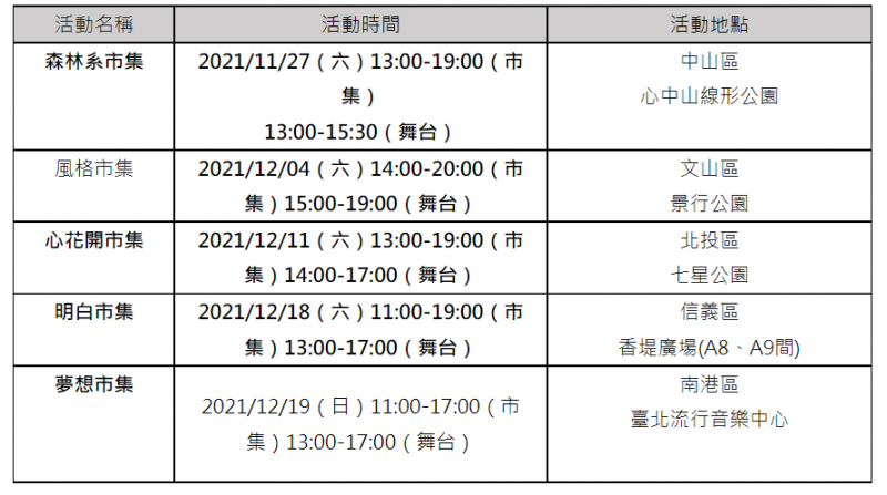 跨年前期活動從11月27日至明(111)年1月1日同步點亮臺北,一連5場週末活動,與民眾一起為2021倒數,告別因疫情停擺的生活,一起邁向2022年。副市長蔡炳坤表示,希望大家一起把防疫工作做到最嚴謹,不只平安還要勇敢面對,從現在開始為2021年倒數,一起迎接2022年,今年在中山、南港、信義、文山、北投萬華共六區都有燈飾裝置,總共五場活動及市集,保證讓大家12月來臺北週週有得拍、有得玩。