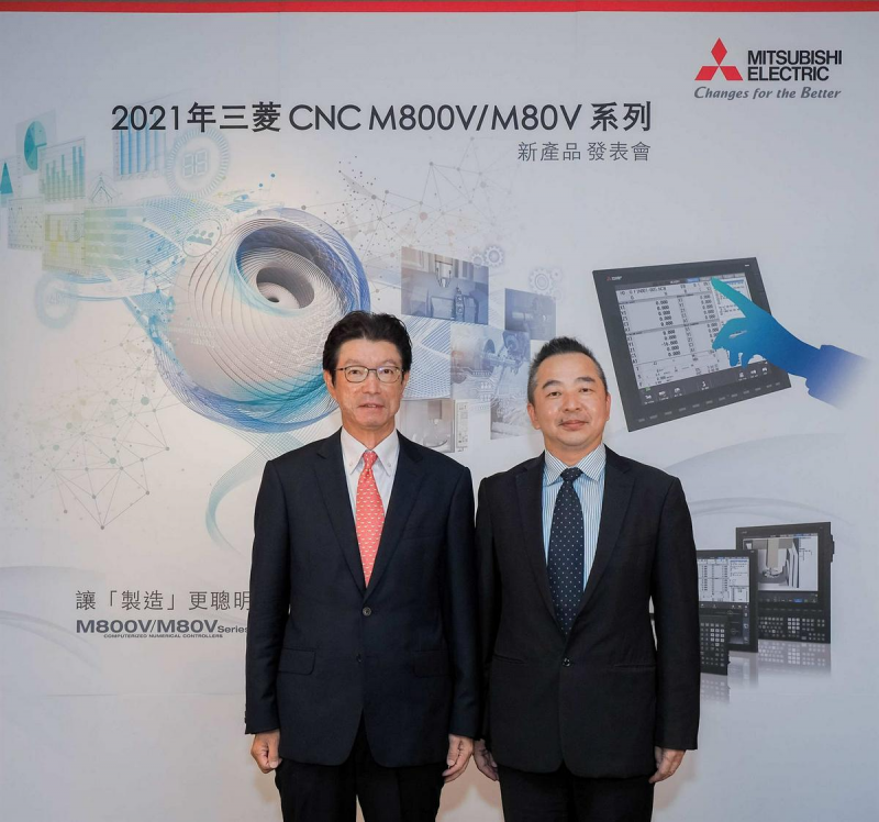▲三菱電機發表全新CNC控制器 M800V/M80V系列,為智慧機械產業升級提供解決方案 (由左至右為台灣三菱電機董事長 花岡尚夫 、FA事業部事業部長 周志騰)。