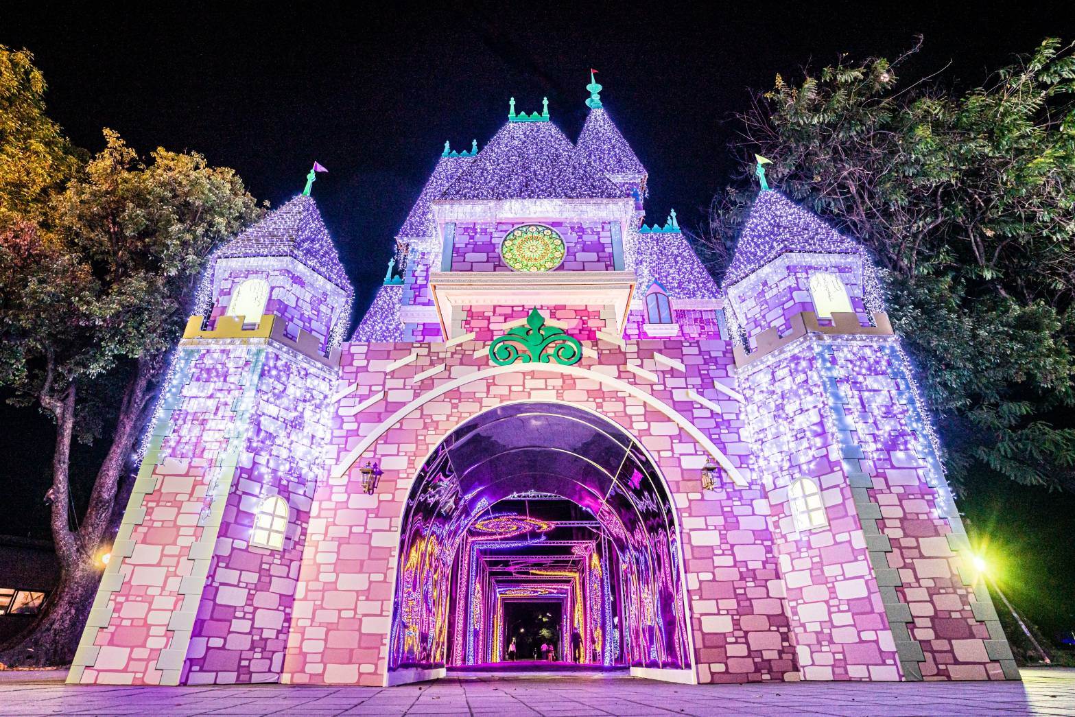 今年屏東聖誕節主打「夢幻聖誕」,高達12米的主燈「冰雪城堡」、幻彩奪目的「魔幻路徑」外,還有網美打卡聖地的光海「星光飛舞」及高達10米的「奇想樹屋」等燈飾,將夢幻浪漫氣氛帶到屏東公園,讓公園籠罩在粉紅泡泡的聖誕氛圍中。