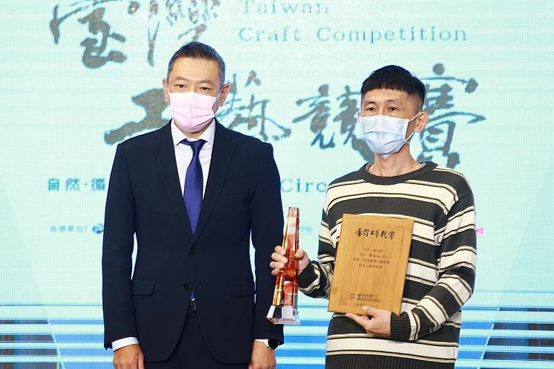 新光三越文教基金會董事長吳昕陽(左)頒贈2021臺灣工藝競賽「新光三越特別獎」獎座及獎狀予得主林志航
