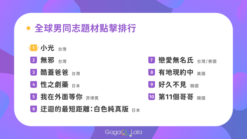 2021年GagaOOLala全球不分區,男同題材影片點擊排行