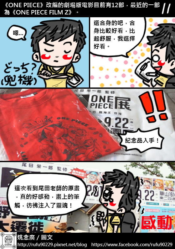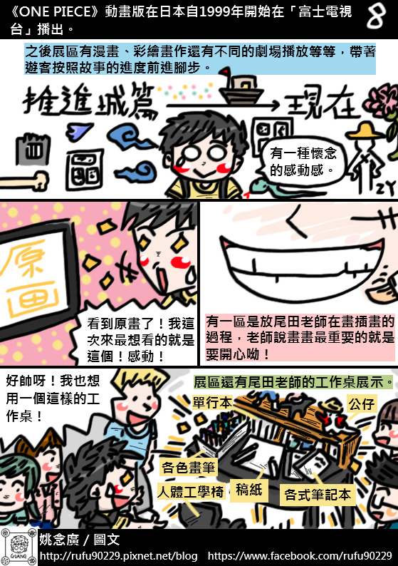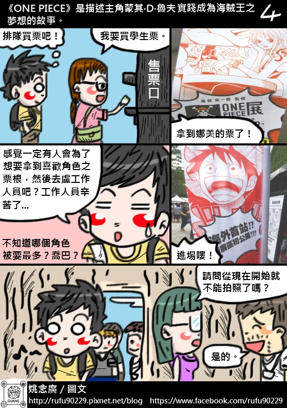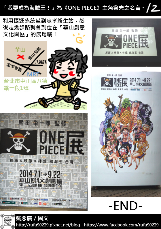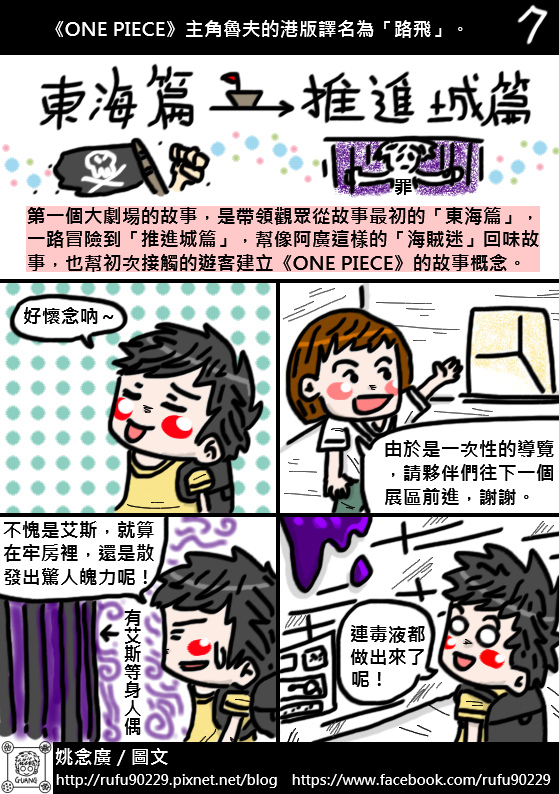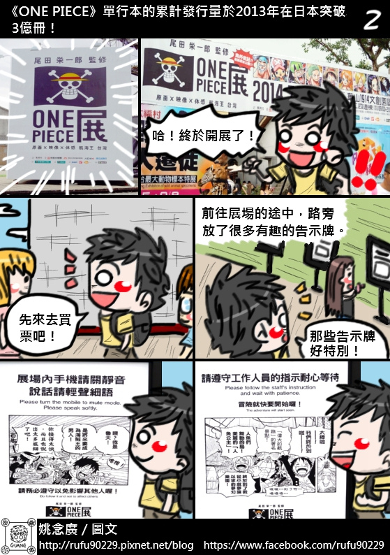 在螢幕前的讀者您好,非常榮幸讓您看到這篇遊記,我是支持《ONE PIECE》目前約14年的「海賊迷」阿廣,也是跟「黑足」香吉士一樣喜歡正妹的阿廣,還是會為了買日版「海賊女帝」P.O.P公仔而餓肚子順便減肥的阿廣,每個星期等連載已是日常生活的一部份了。這次會用圖文書的形式去創作這篇遊記,主要是因為「展場內不能攝影」的關係,所以就想說用圖文漫畫來分享好了,畢竟這個展覽的意義對身為海賊迷的阿廣來說很重要,與其說是分享,不如說是記錄還比較貼切。結果想都沒想到,這篇遊記竟然花了近十個工作天的時間才完成,工程超乎自己意外的久呢!所以就乾脆很自HIGH的把整篇遊記篇幅用很長算了!由於這次展覽是「一次性的動線遊覽」,所以阿廣的小腦袋瓜能記的東西有限,若有資訊不足或錯誤的地方,還請有去過的大大幫忙指正了,感謝!