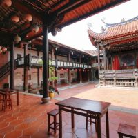 「林文察於 1858 年興建了第三進,第一進及第二進是其子林朝棟於 1870 年至 1883 年所增建。」導覽老師解說起興建背景,而抬頭仰望門神時,不難發現一雙炯炯有神的眼睛彷彿跟隨自己移動,「這是四方眼畫法,讓人們覺得舉頭三尺有神明。」