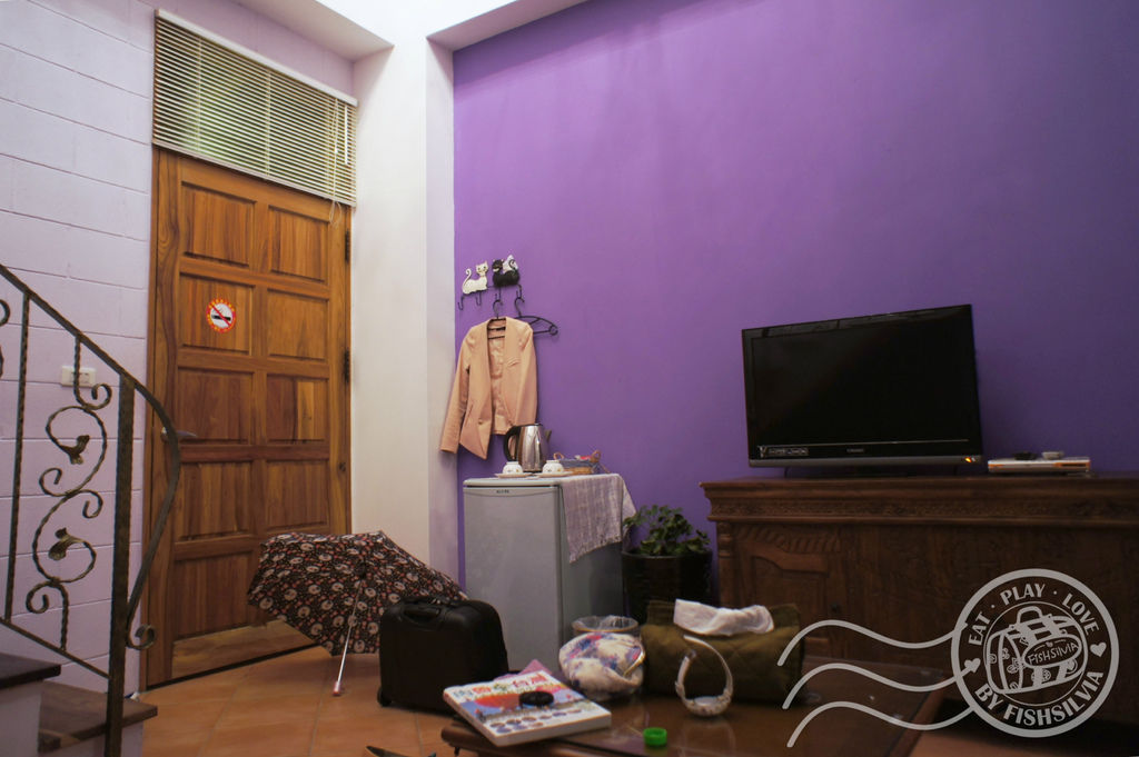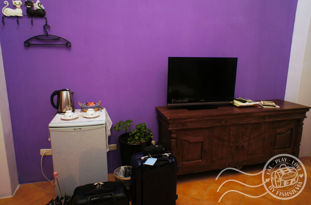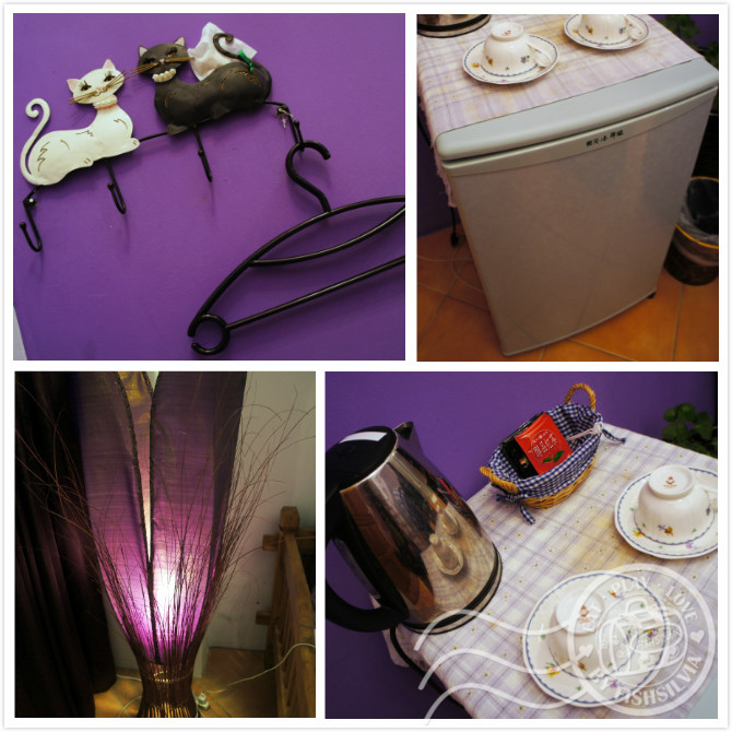 電視、衣架、冰箱、煮水壺、咖啡茶包...一些基本配備都準備好了,兼顧整體色調的紫色花型立燈帶來一股南洋味兒