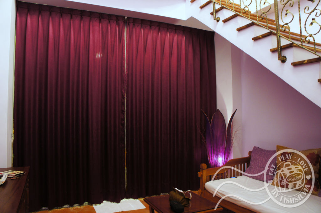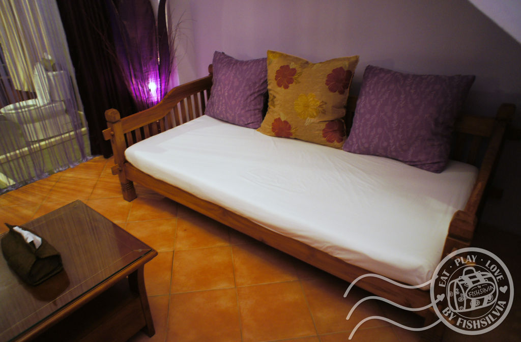 幾乎可以睡下第三人的木架布沙發,依然用紫色抱枕打造悠閒情調,晚上窩在這裡看電視聊天真是太舒適啦~