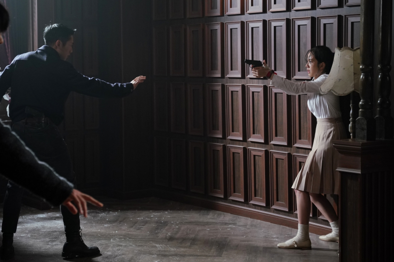 而英路其實也有許多驚險萬分的「動作戲」,不管是在晚點名時飛簷走壁攀牆溜進宿舍房間,或是為了躲避舍監搜索,和林守護一起懸掛在校舍窗外,都讓粉絲捏一把冷汗。Jisoo打趣地提到,「在第一集中英路趕著去接電話的情景也讓我非常印象深刻。接電話對住宿生而言是一件大事,我很喜歡那場戲。那時候沈重的攝影機甚至直接安裝在我身上,讓畫面可以配合我奔跑衝刺的動作。」當然,在挾持事件背後的陰謀逐漸顯露後,英路和守護也被迫面對更多拔槍相對的爭鬥與對峙,粉絲千萬不要錯過。