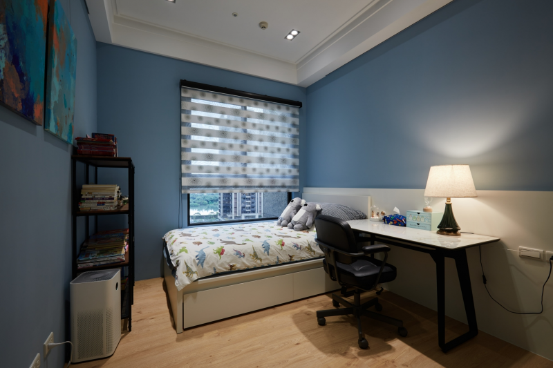 男孩房則以藍色為主題,加上遮光簾,床鋪下方有收納空間。