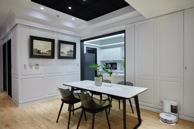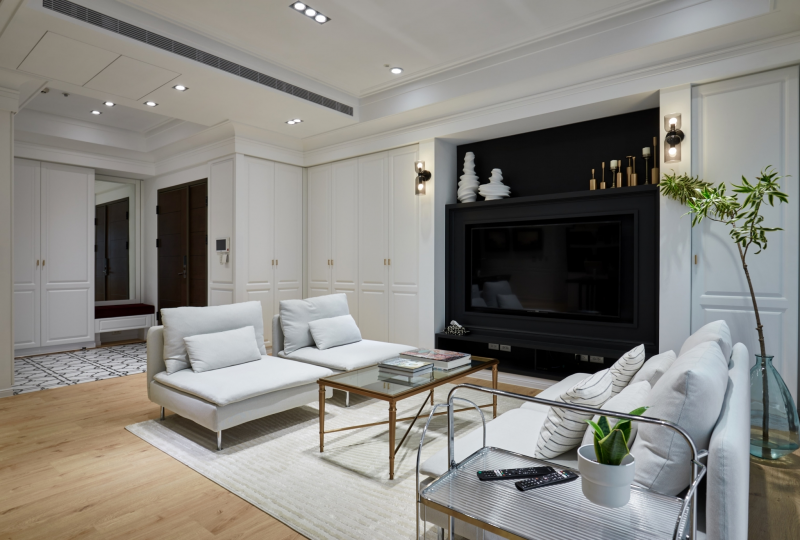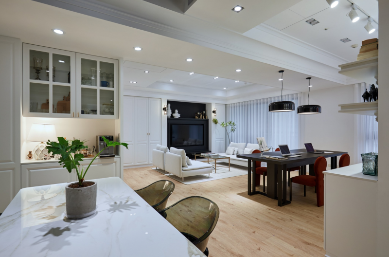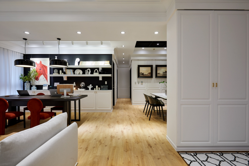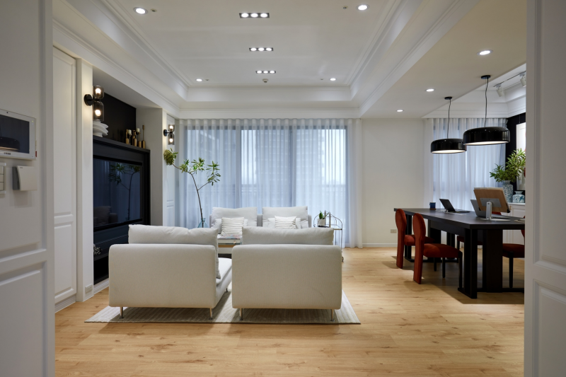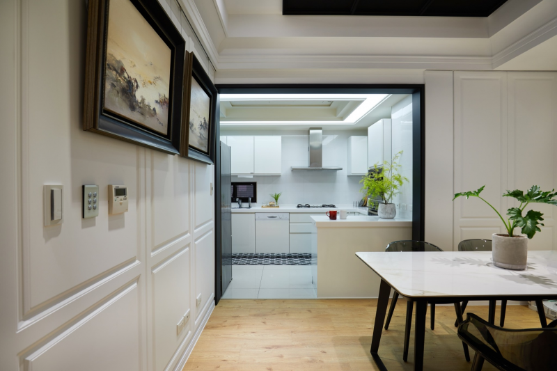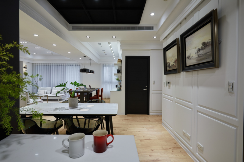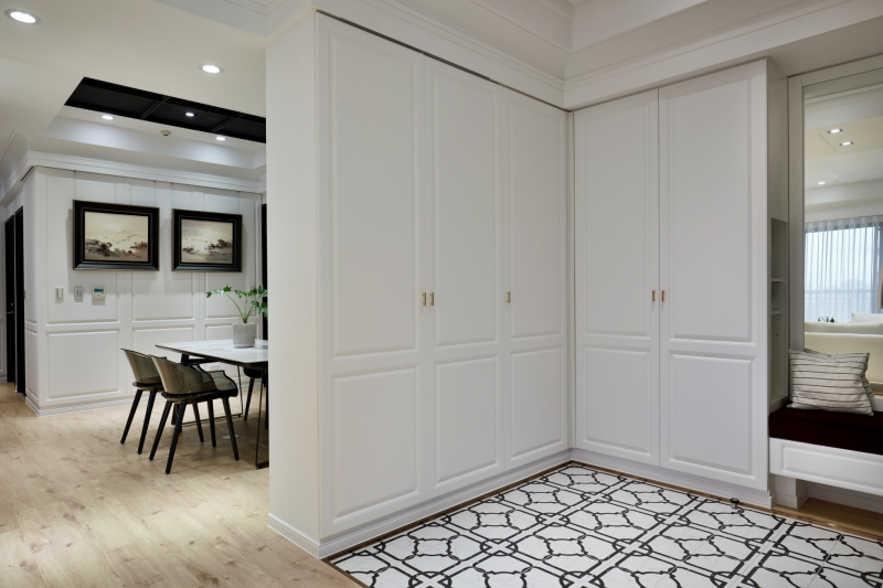 以優雅潔白的用色,演繹美式風格元素,從玄關進入公領域,壁面以系統板材設計,表現美式的細膩氛圍。