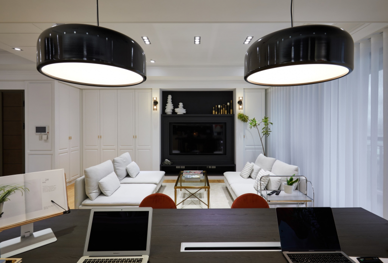 閱讀區與餐廳區採開放式空間,搭配吸睛的吊燈提升設計質感,並突顯了空間層次。