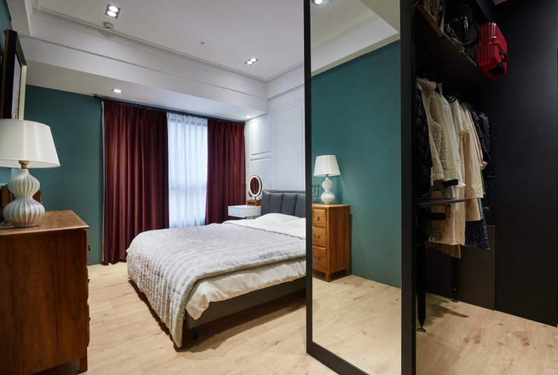 主臥規劃了更衣室,搭配大片穿衣鏡,床頭主牆則採用系統板材,創造通透富有層次的空間脈絡。