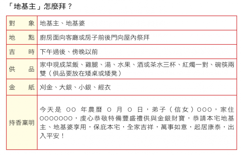不管地點是在大門口或廚房,都要朝屋內拜,案桌不用太高,約在膝蓋位置即可。時間在當日12時~下午3:00前。拜拜的菜餚以家常菜為主,素食、魚肉、水果皆可。盛重的話可準備兩人份飯菜、三杯清酒、量杯裝8分滿的米成為香插,1或3柱清香即可。每間隔3~5分鐘添一次酒,總共添3次酒。
