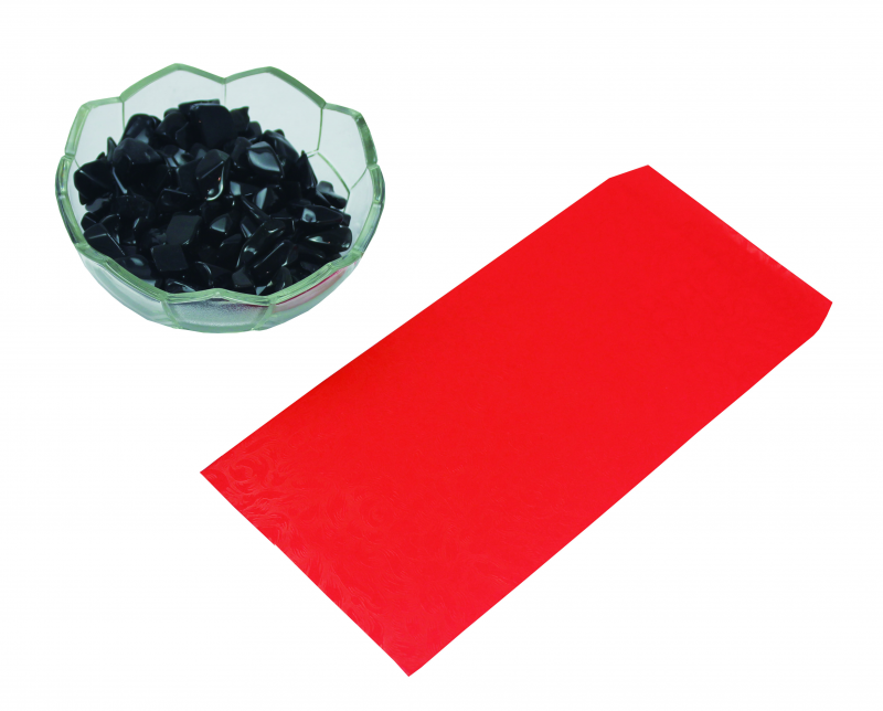- 將黑曜石晶沙裝進紅包袋,約三分之一滿。
