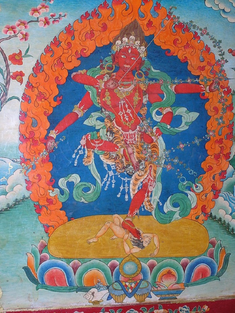 本尊形象為舞動之天女姿態,全身紅色,三目,四臂,莊嚴年少,姿態微妙,面孔半喜半嗔,半喜代表其圓滿清淨戒律的能力,半嗔代表降伏煩惱罪垢的能力;四臂各執優婆曇花所製成的弓、箭、鉤、索,象徵拯救陷於感情等所有煩惱困擾的眾生;一般右腳勾起作,左腳踏住著,全身光環圍繞,放射大紅光明。