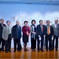 圖說:胡克敏紀念展貴賓合影,從左至右分別為:書法家蔡明讚、書篆家薛平南、羅振賢教授、蘇峯男教授、楊同慧副館長、策展人李中華、劉兆玄院長、黃光男校長、洪孟啟部長、書法家陳維德。