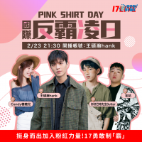 粉紅有力量,17LIVE勇敢制霸!因應2/23 (三)為今年的「Pink Shirt Day國際反霸凌日」,17LIVE於當天邀請人氣鮮肉男神王碩瀚及17LIVER巴特先生、祐祐、糖糖兒,一起穿上「17LIVE反霸凌粉紅T」連線開播,討論各自近期觀察到的反霸凌風氣,並分享自身或周邊友人受到霸凌的事件,呼籲大家要「17勇敢制霸」。
