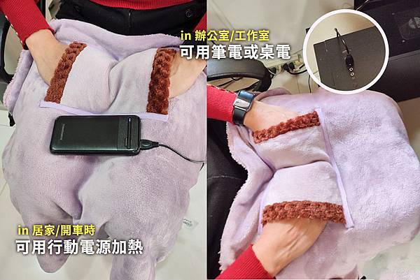 這邊跟大家分享小編自己最愛用的使用方法,像最近天氣寒冷,常感覺手腳冷的卡!!! 可以搭配一罐常用的乳液,均勻抹在想熱敷的部位,在將毯子發熱的位置蓋在上面,小編這次是熱敷膝蓋,插上行動電源馬上就感覺暖暖的~超級溫暖又舒服~