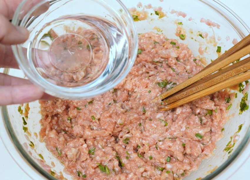 3.以一把木筷順時鐘或逆時鐘畫圓的方式絞拌,100ml 的水分成2~3次加入肉餡,邊加水邊畫圓攪拌,將肉餡攪拌出筋(富有黏性)即可。
