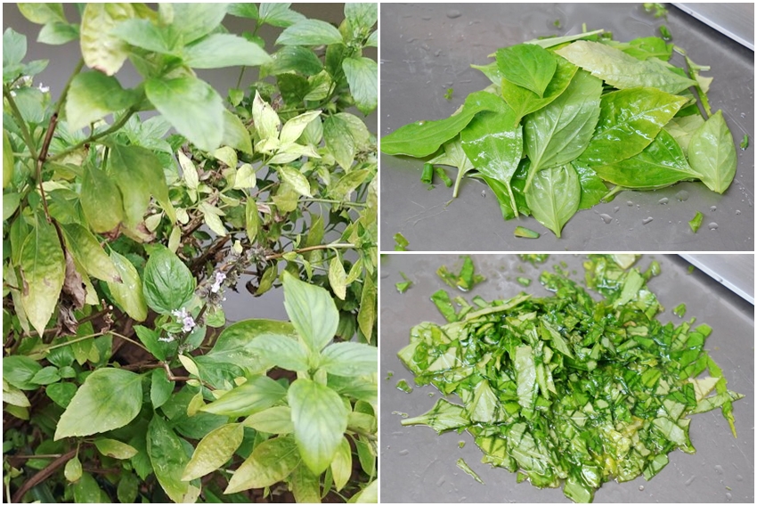 1.九層塔、蔥、薑先切碎。