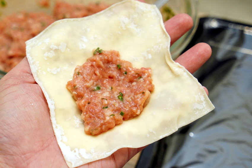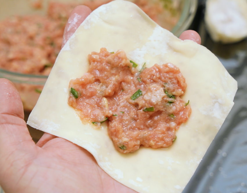 4.以湯匙取適量肉餡,包入餛飩皮,捏成自己喜歡的外型即可(以下文中圖示列出三種常見教學)。