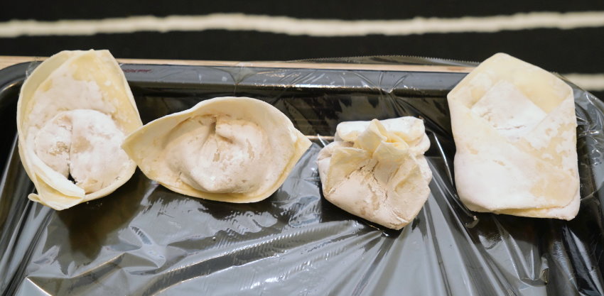 ▼接下來準備好另一碗水(包合用)、另外盤子上鋪上保鮮膜,包好後放冷凍一小時,餛飩變硬後會很方便取下,到時候再一顆一顆放進夾鏈袋,再放到冷凍保存就很方便。