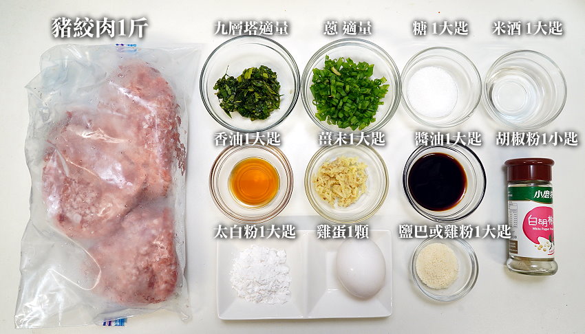 ▼今日分享的餛飩配料如下,大致上都被我調整成1大匙或1小匙,這樣口味適中,也方便大家記起來。