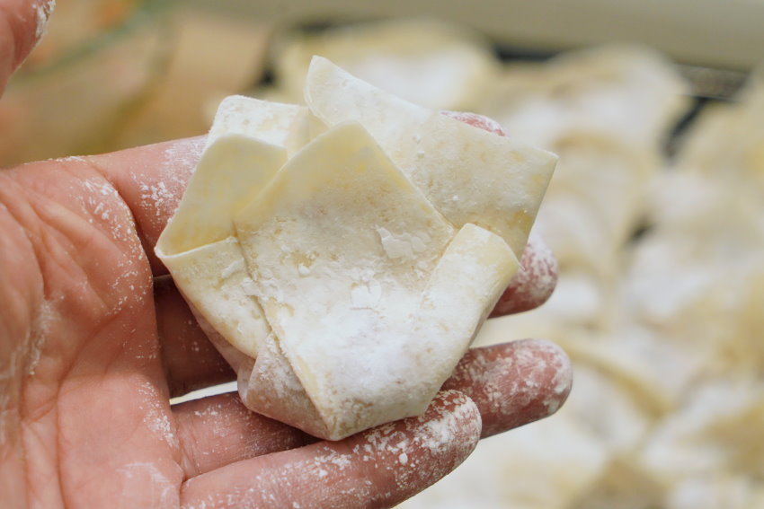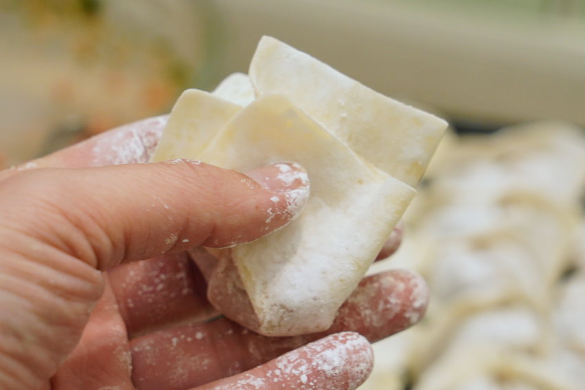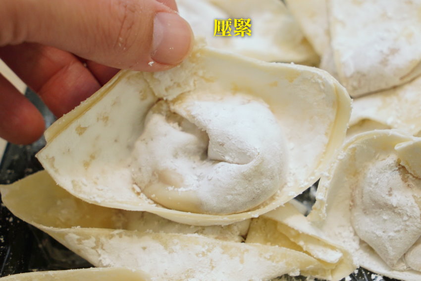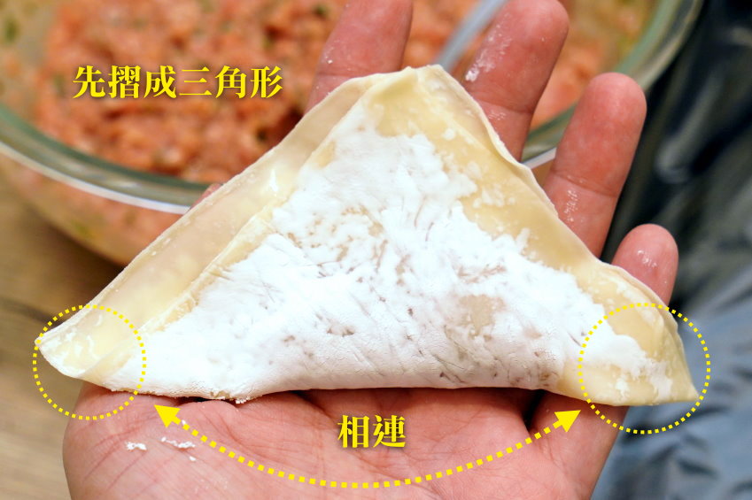 ▼先來教大家最簡單、快速的包法,為了包大餛飩,我餛飩皮買的是大尺寸,如果大家買的是小尺寸,包法一樣喔!