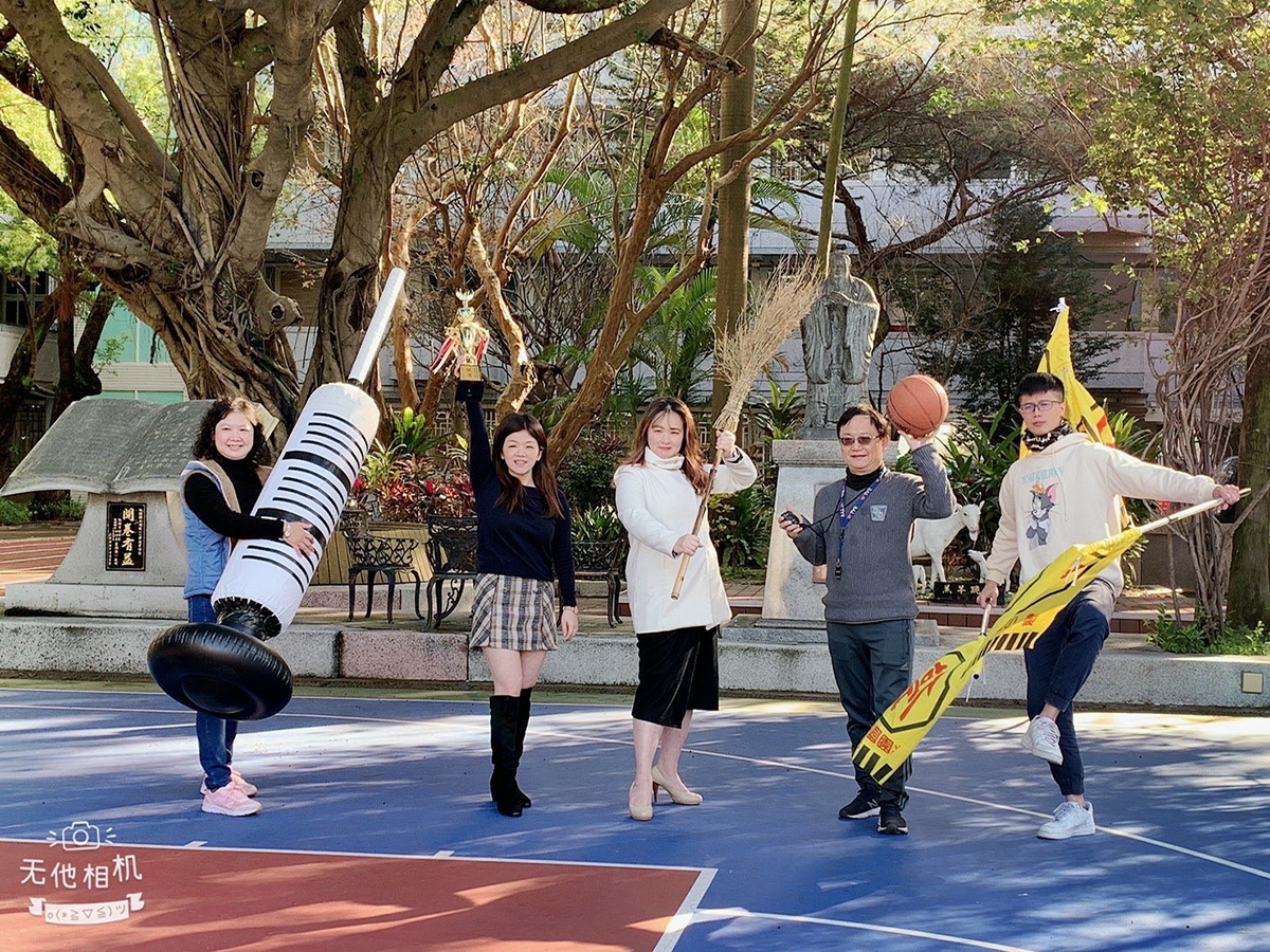 其中,學務處師長的拍照風格,相當吸睛,包括針筒、掃把、獎盃、籃球等都成為道具。楊雅真校長說,像護士阿姨是健康守護神,手拿針筒代表著全校教師的疫苗施打,共同守護學童健康,訓育組負責藝文競賽,以獎盃代表歷年學生的表現。學務主任手持竹掃把,象徵衛生組同仁盡心盡力維護環境及防疫工作,學務處主任也代表1位魔法教師,騎著掃把穿梭校園指導。最後,體育組長手中持的是籃球,是學生們最喜歡的運動項目,透過運動健身強健體魄。生教組拿導護旗,指導學生交通安全,落實生活教育,快快樂樂的上學平平安安的回家。