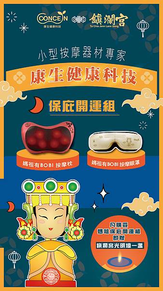 愛,隨時都在」為品牌理念的康生健康科技董事長白如娟,為了擴大關心、關愛與健康的服務,特地開發出大甲媽祖聯名限量款的Bobi按摩枕與Bobi按摩眼罩,更同步在官網舉辦「買保庇開運組(Bobi按摩枕+Bobi按摩眼罩)送點鎮瀾宮專屬光明燈」的加碼活動,讓大家在享受CONCERN專業按摩器紓壓的同時,也能感受到媽祖的加持保庇,從身到心到靈,都能一次到位放輕鬆!名額有限,大家不要錯過了喔!!