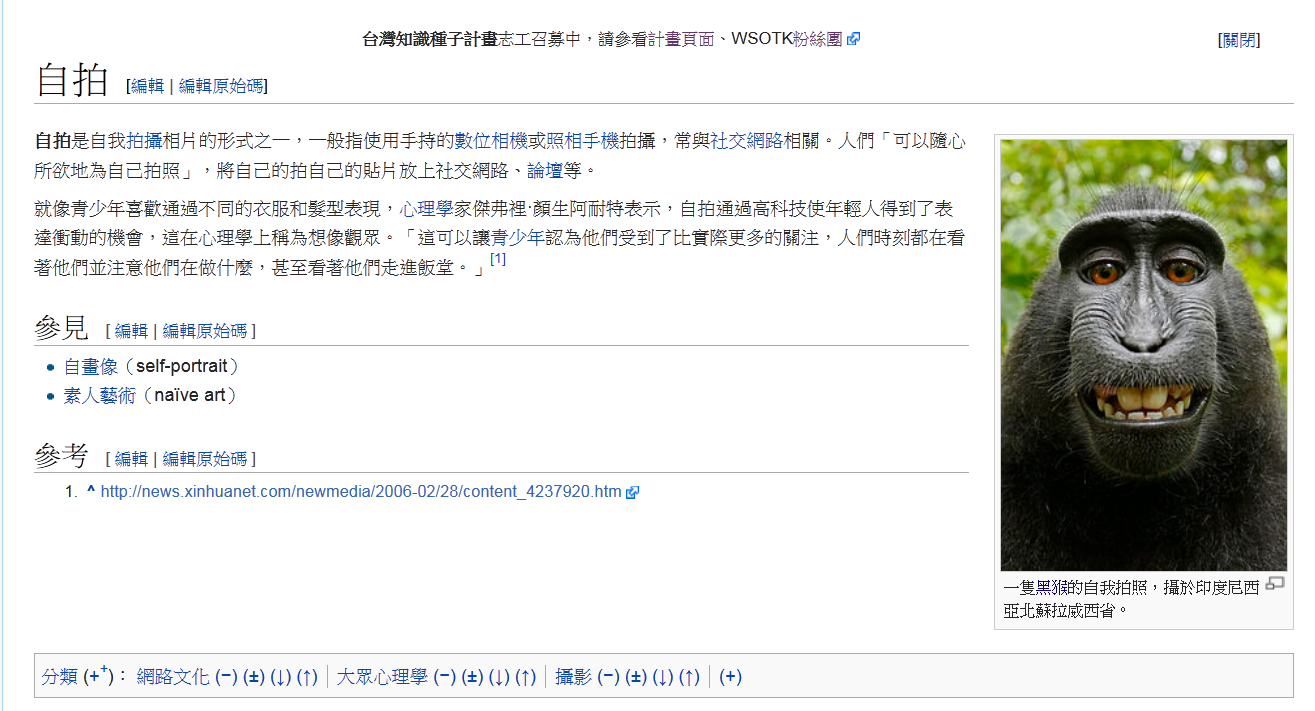 ▲ 中文維基百科上的自拍條目,也用到這張黑冠獮猴的自拍照